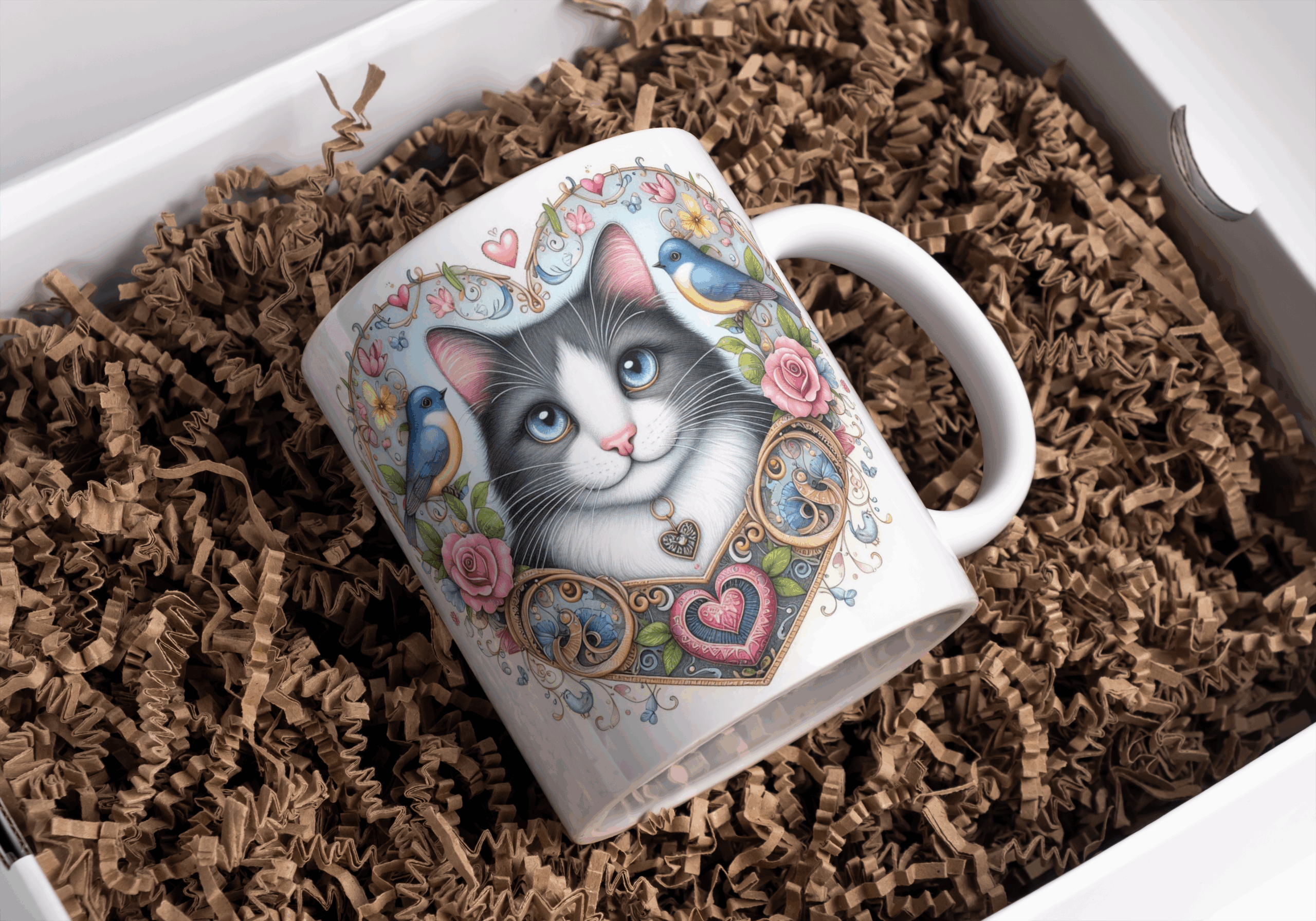 Beker grijze kat in bloemen hart