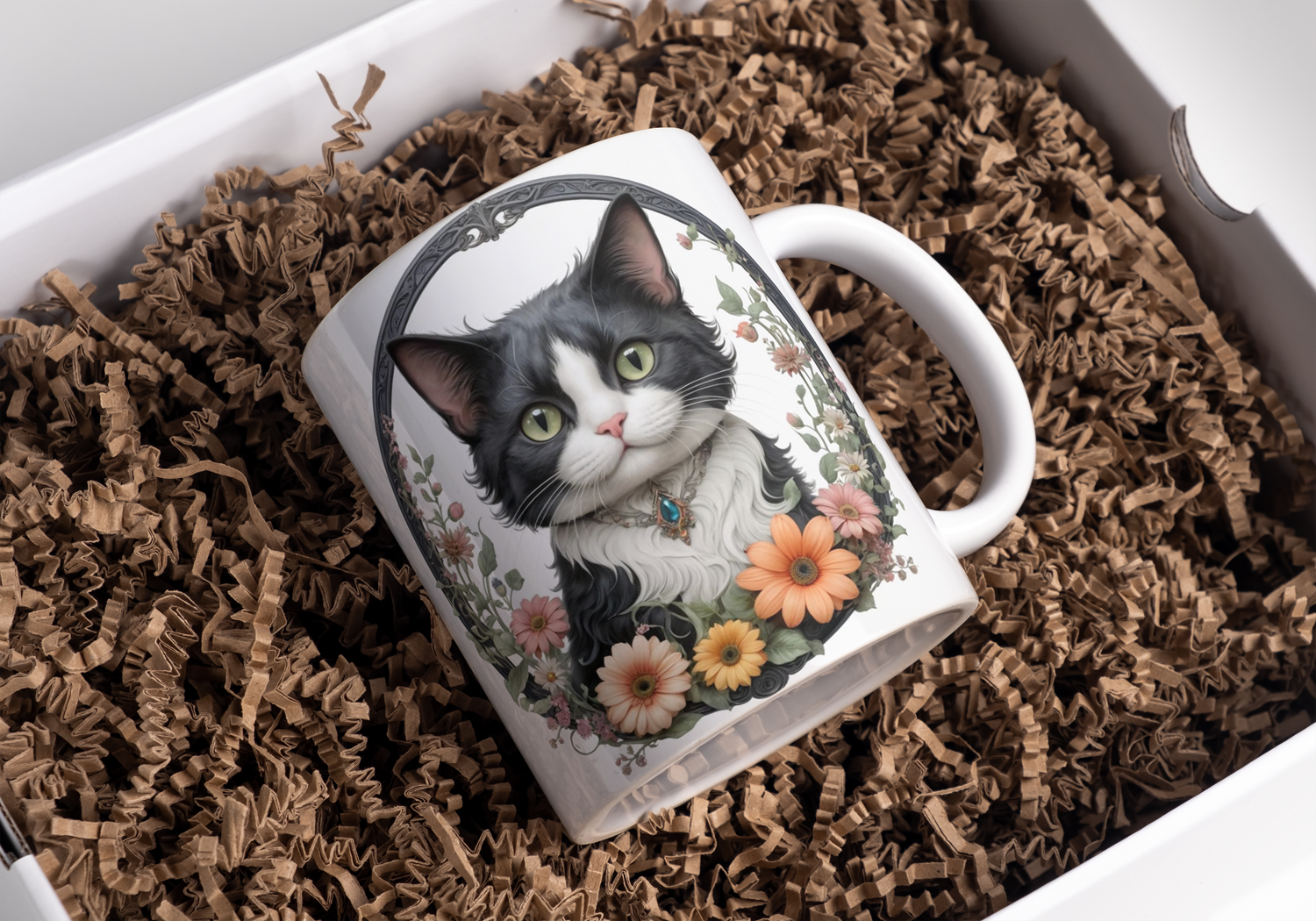 Beker zwart met witte kat bloemen krans